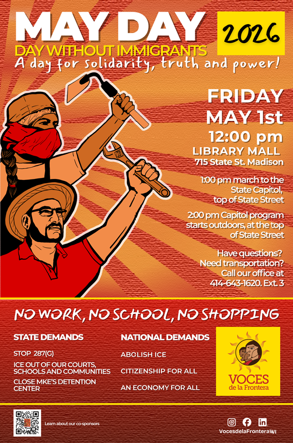 Friday, May 1st, is a Day Without Immigrants, a day of solidarity, truth, and power. There will be two main events in Wisconsin in Madison and Milwaukee. Madison Agenda: 12 pm: Start at Library Mall (715 State St.) 1 pm: Mass march to the Capitol (State St) 2 pm: Main program outside the Capitol Building (State St).